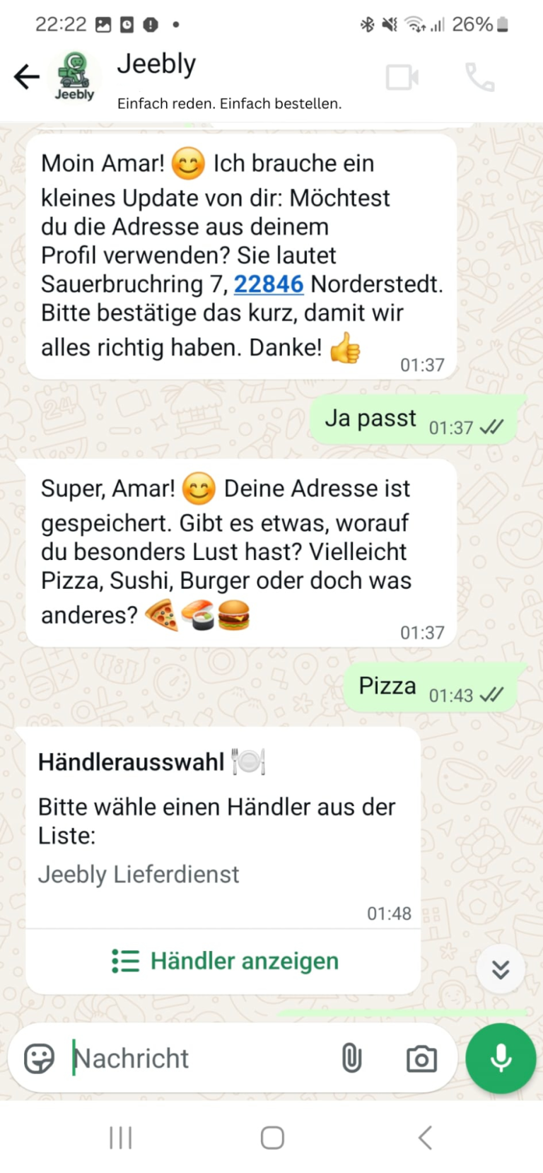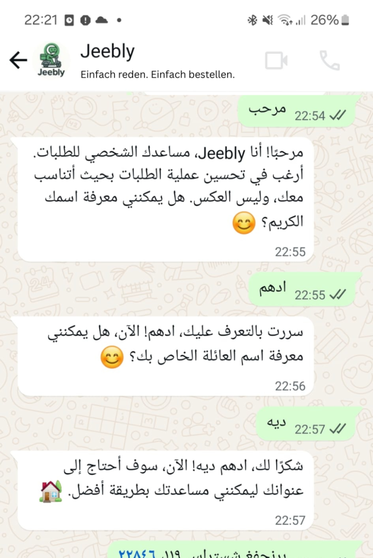 💬 Du schreibst oder sprichst zu uns in deiner Sprache z. B.: „Ich hätte gern 2 Falafel ohne Brot“